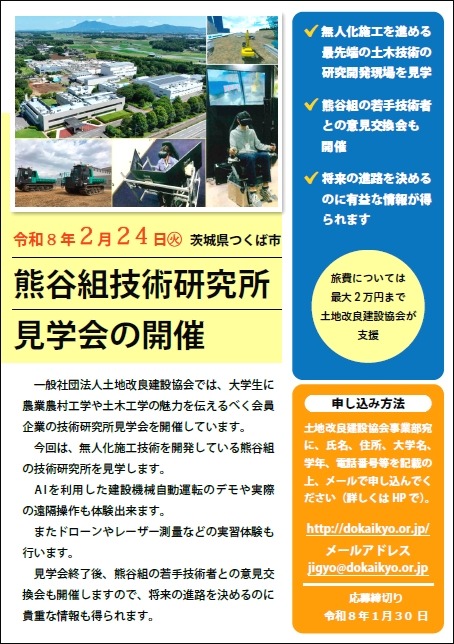 (一社)土地改良建設協会主催の、農業農村工学系の学生を対象にした技術研究所見学会が開催されます。 募集案内は、こちらから(PDF) ・応募〆切 2026年01月30日(金) ・開催日 2026年02月24日(火) 熊谷組技術研究所 茨城県つくば市(つくばエキスプレス線 万博記念公園駅) https://www.kumagaigumi.co.jp/tech-solution/research.html 一般社団法人 土地改良建設協会のホームページは、こちら。 公募・イベント 農業農村工学系の大学生のための技術研究所の見学会のご案内 【ご案内】JST-RISTEX「科学技術イノベーション政策のための科学」研究開発プログラム最終シンポジウム 2026(令和8)年度 総合地球環境学研究所 超学際探索研究の公募について 国際農林水産業研究センター 令和8年度採用 研究職員(若手育成型任期付)等の公募 令和7年度 田園自然再生活動の集い ~「千」の「地」の「知」~ のお知らせ 第34回 微粒化シンポジウムのお知らせ GPS/GNSSシンポジウム2025のお知らせ 令和7年度 土測協講習会「測量設計分野における3次元データの活用」のご案内 令和7年度ADCAセミナー「農業から広がる国際協力の世界」のお知らせ 第21回バイオマス科学会議のお知らせ