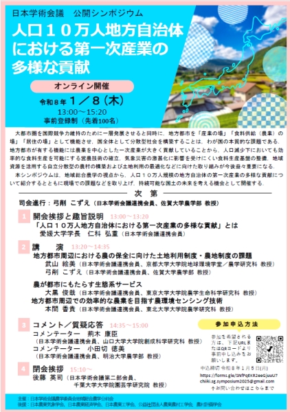 本シンポジウムは,地域総合農学の視点から,人口10万人規模の地方都市の第一次産業の多様な貢献について紹介するとともに現場での課題などを取り上げ,健全な地方都市と持続可能な国土の未来を考える機会として開催する。